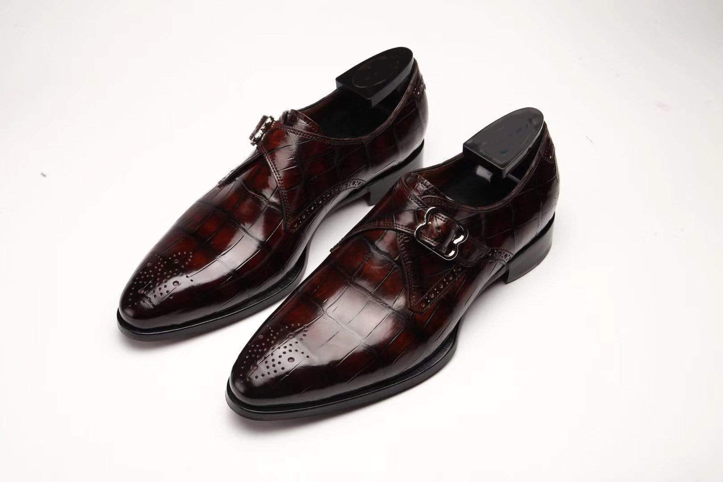 Crocodile Shoes Wine Red Crocodile Leather Monk Strap Shoes