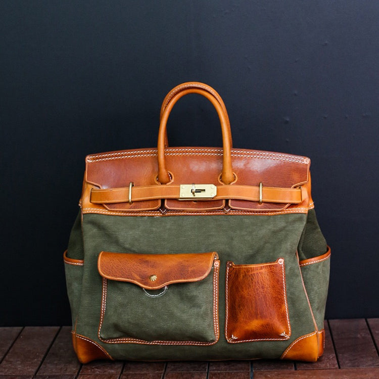 Unisex New Oversize Genuine Vintage Oil Wax Leather Top Handle Canvas Bag