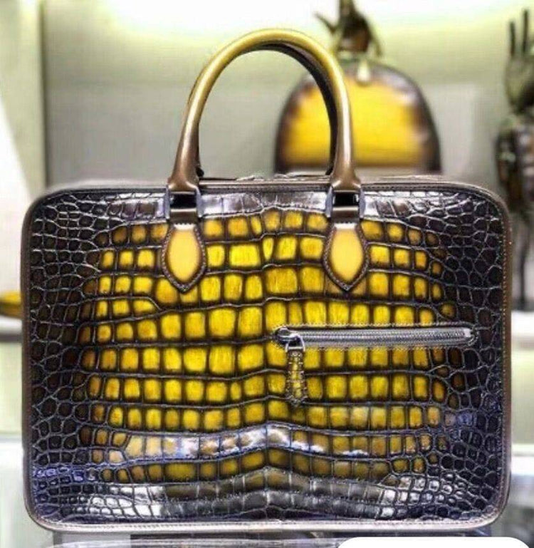 Preorder Vintage Crocodile Briefcase, Vintage Green/ Yellow Genuine Crocodile Skin Leather Business Laptop Bag