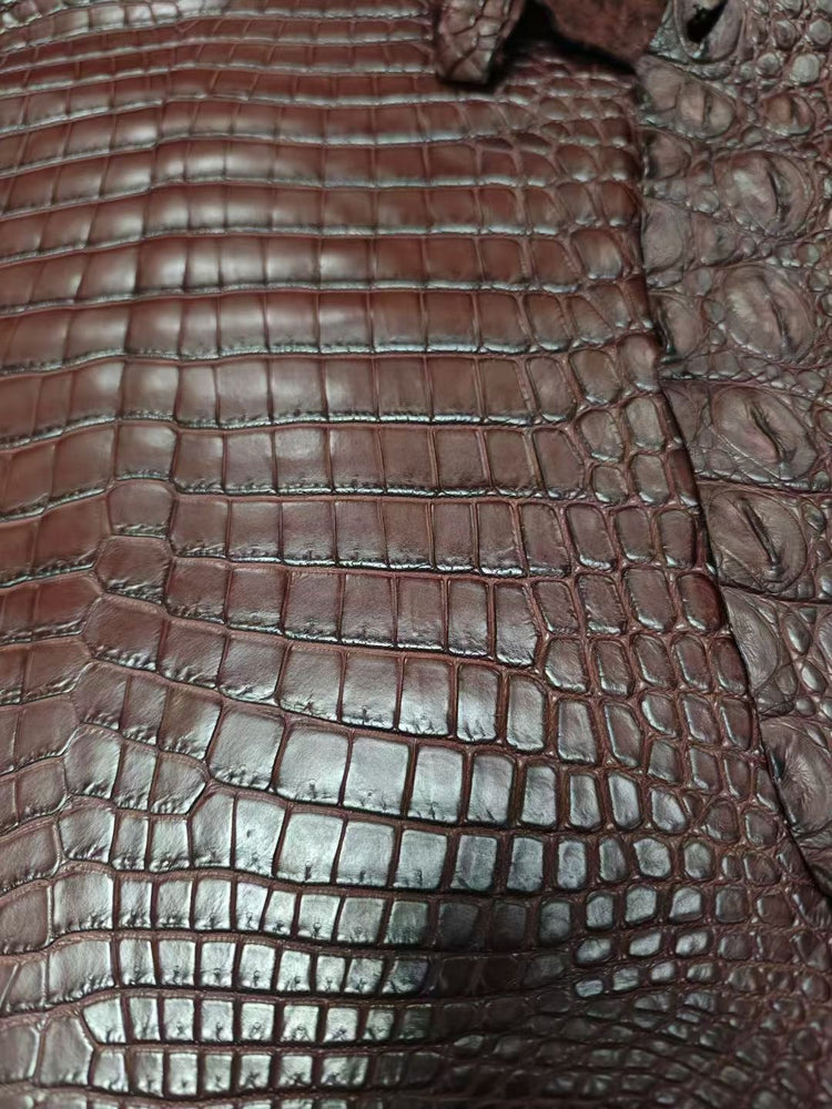 - Da cá sấu Nile nâu cổ điển hai tông màu nhập khẩu đẹp mắt, nhuộm nước độc đáo kết hợp với chất liệu canvas trắng.