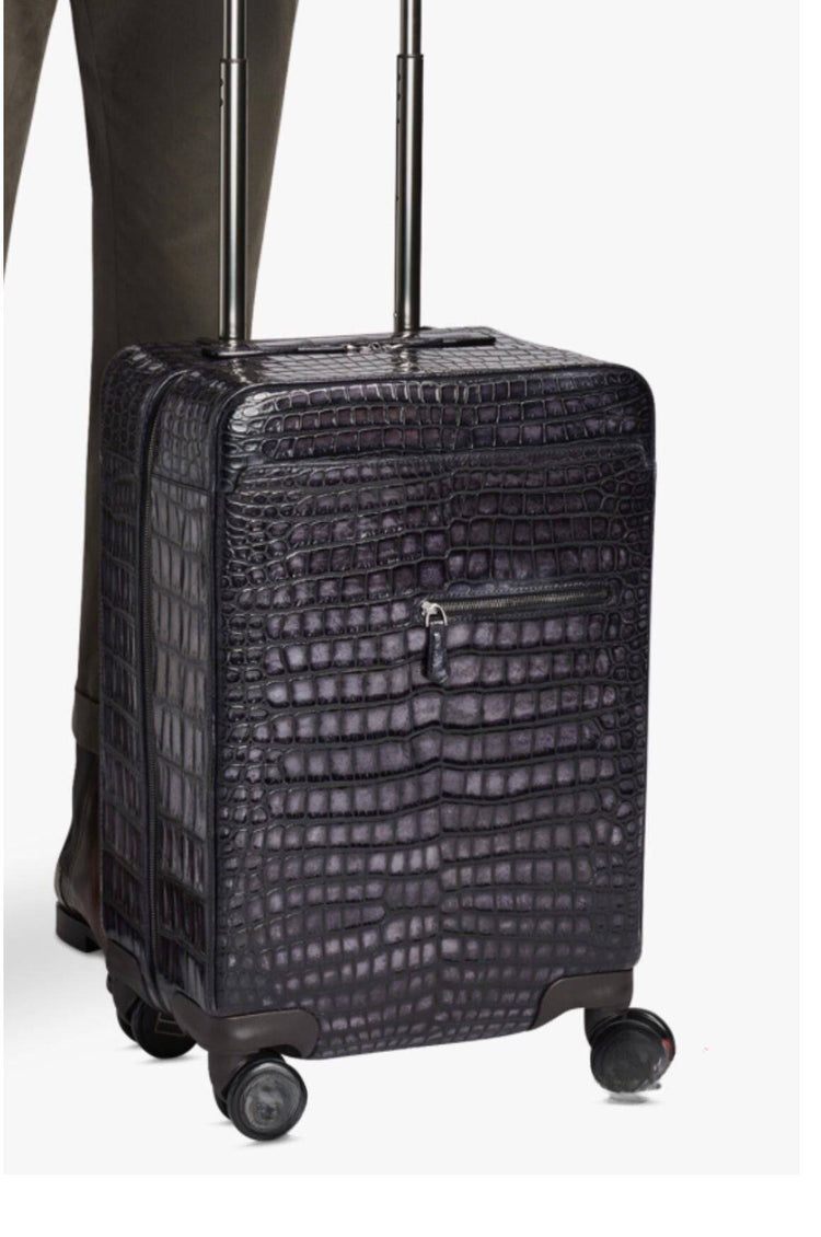 This luxury version of our popular elements--a simple, stylish luggage bag.This bag is made from imported crocodile belly leather ,durable and long lasting . It features 4 spinner wheels trolley case with push button handles locking. zip closure for easy access and grab handle for hassle-free portability.