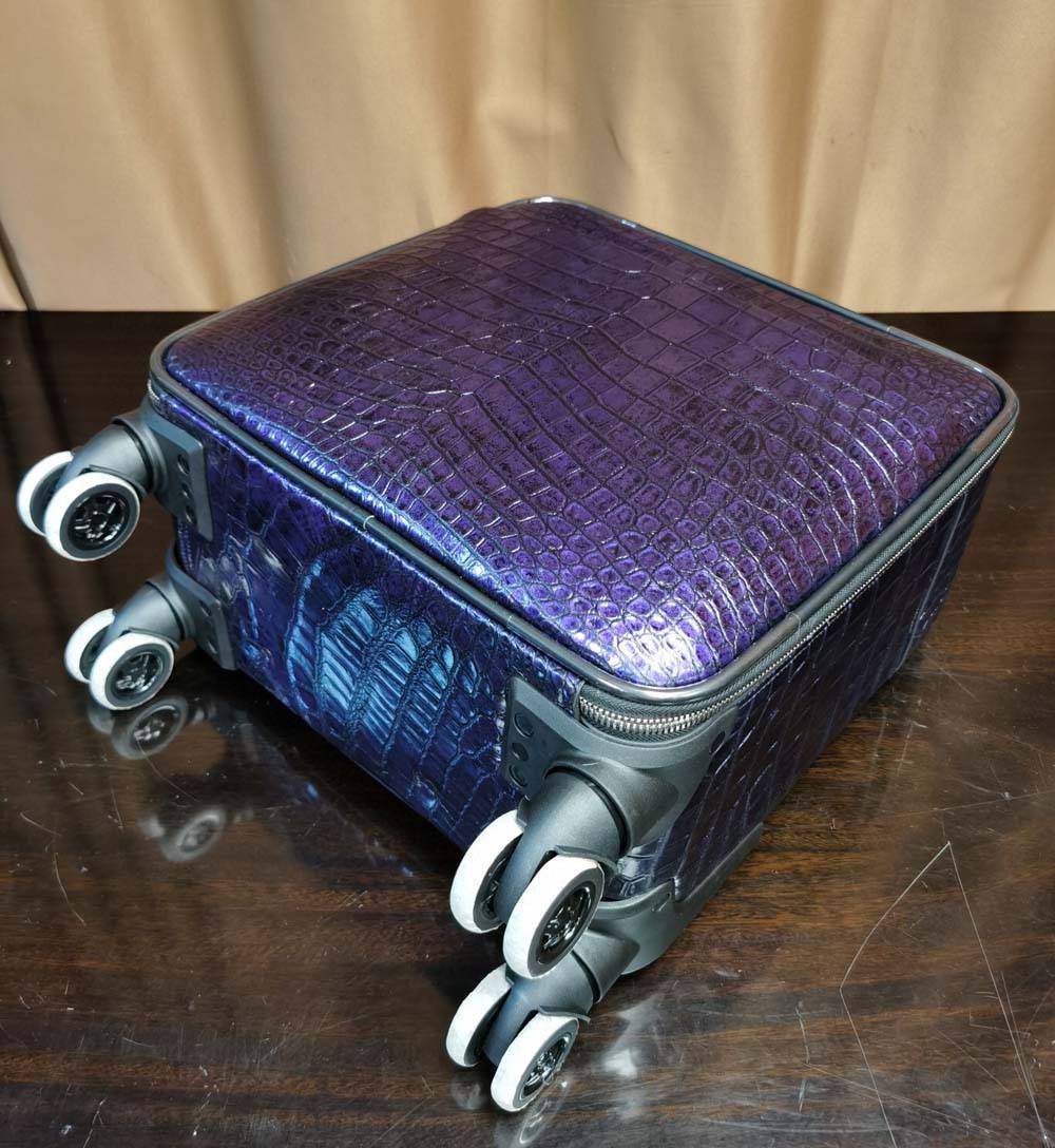 This is our popular elements--a simple, solid build and stylish luggage bag.This bag is perfect travel companion. It made from imported genuine crocodile skin leather material ,durable and long lasting . It features a zip closure for easy access and grab handles for hassle-free portability.This carry-on luggage size is designed to fit in the overhead bin of almost any flight, anywhere in the world.