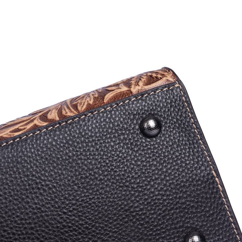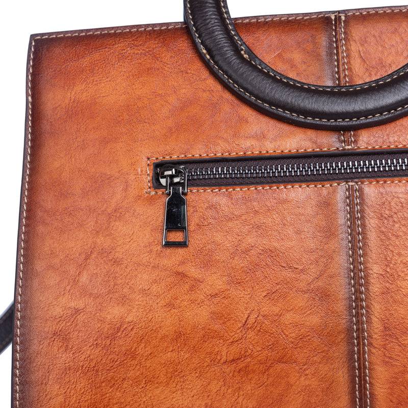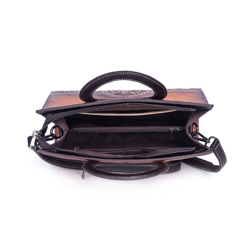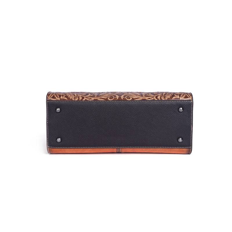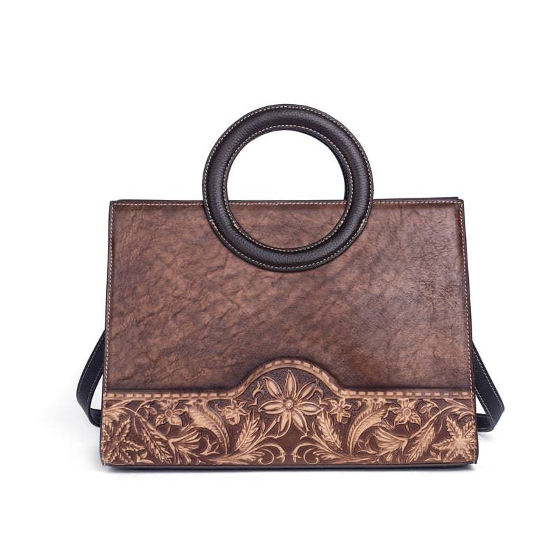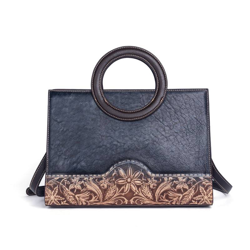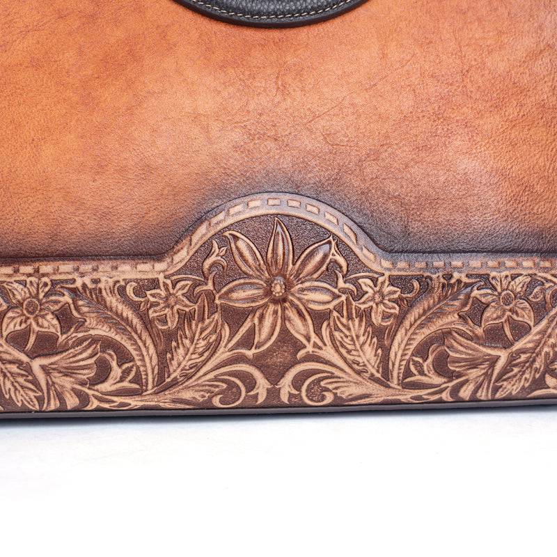 This tote bag is with Hand-selected, tumbled, grainy top grade of cowhild leather with gunmetal tone hardware. Beautiful engraved floral and leaves,painting by hand at the bottom of the front . Destined to become your favorite daily bag, Our handmade vintage leather line delivers a unique alternative to the fashion style for our royal customer .